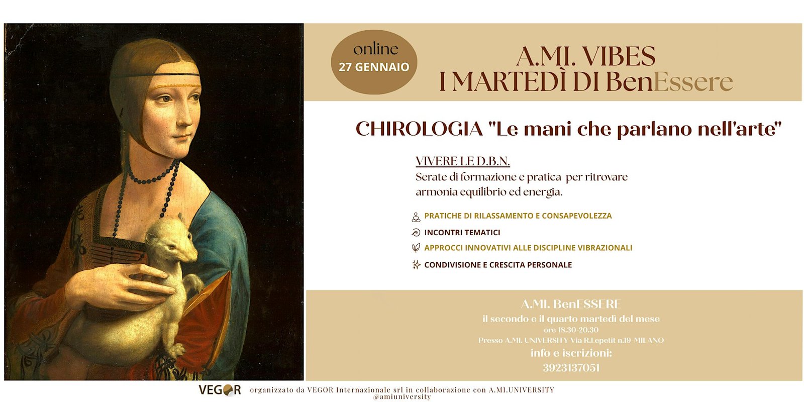 CHIROLOGIA "Le mani che parlano nell'arte" A.MI. Vibes I MARTEDÌ DI BenEssereNASCE A.MI. VIBES: I MARTEDi' DEL BenEsseredue martedì al mese dedicati aVivere le D.B.N. “Vibra, impara, condividi”Serate di formazione e pratica per ritrovare armonia equilibrio ed energiaVegor Internazionale in collaborazione con A.MI. UNIVERSITY apre le porte a un’esperienza di incontro e crescita dedicata agli…