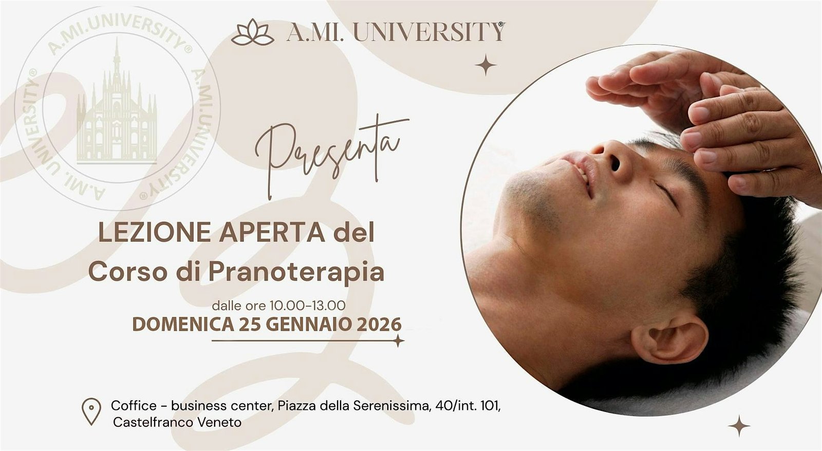 GIORNATA APERTA AL CORSO DI PRANOTERAPIALEZIONE APERTA DEL "CORSO PROFESSIONALE DI PRANOTERAPIA"DOMENICA 25 GENNAIO 2026 DALLE ORE 10.00-17.00pressoCoffice - Business Center, Piazza della Serenissima, 40/int. 101, 31033 Castelfranco Veneto (TV)Senti una forte inclinazione verso le Discipline Bionaturali e il benessere energetico? Desideri aiutare concretamente gli altri a ritrovare equilibrio e vitalità, ma non sai da…